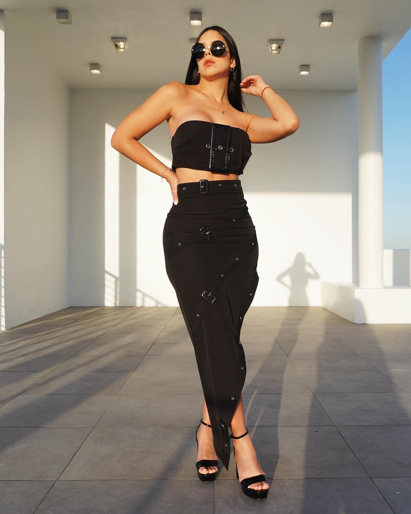 Set dos piezas top y falda asimétrica con cierres de ajuste