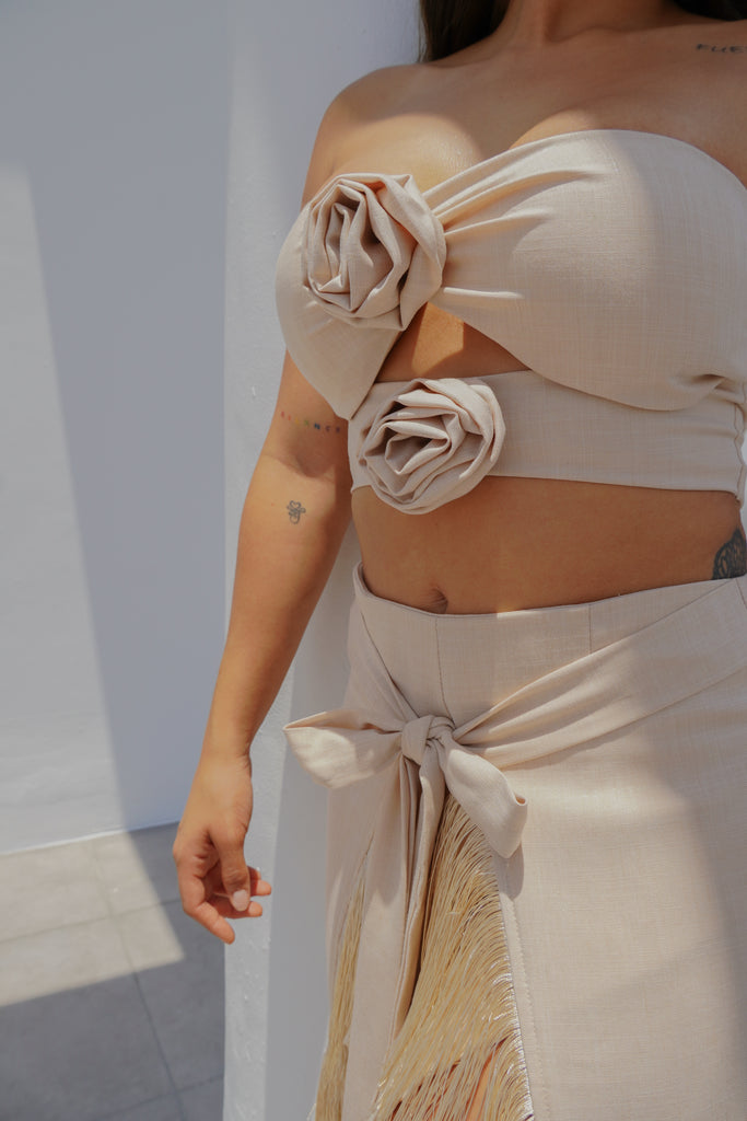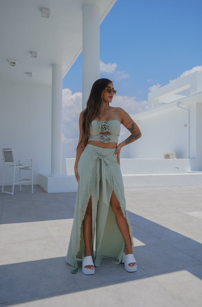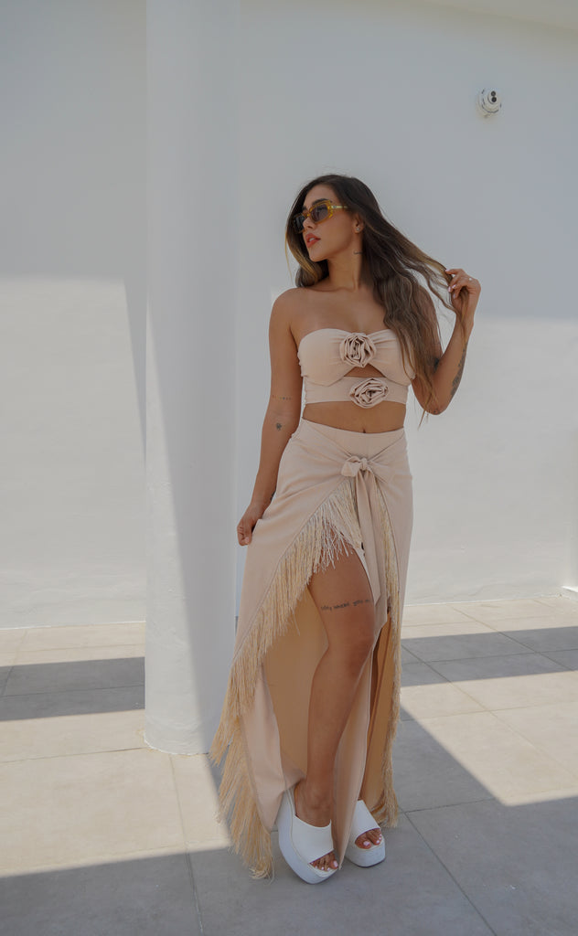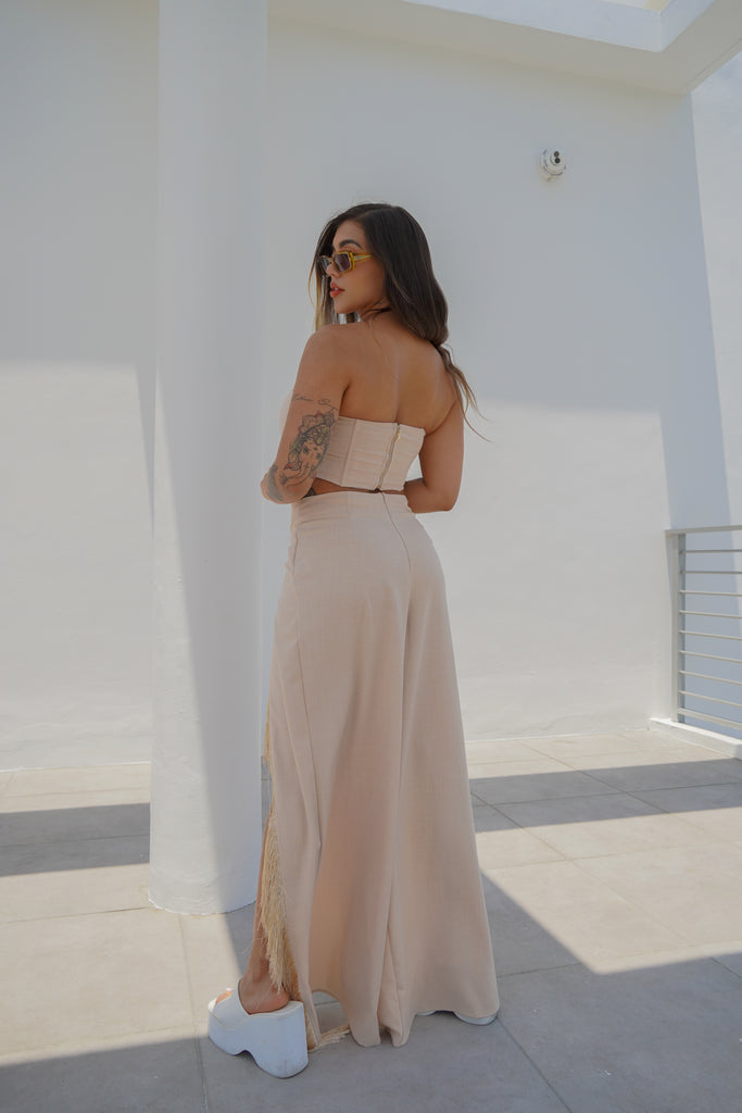 Set dos piezas top con cierre en espalda y falda pantalón con corsages asimétricos . Modelo está usando talla small